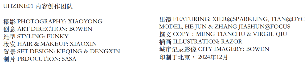 UNICA HOMME 呈现由品牌创意团队制作的 UHZINE 第一期《URBAN TOUCH》, 通过影像、文字专题及实体印刷的方式多维度的呈现品牌24/25冬季“CYBER MOSAIC”胶囊系列。在摄影师的镜头下,两位新锐模特穆拜西尔与何俊置身于街头,演绎发生在城市的奇妙故事,自由探索城市空间,尽情玩乐、即兴演奏,徜徉于属于他们的奇幻梦境,以此让音乐与时装的关系有了更具象化的体现。