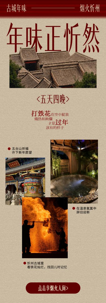 年味,是中国人最深层的文化情感之一。“年味正忻然”聚焦忻州年俗,线路串联雁门关、佛光寺、五台山与忻州古城,观山观水亦观心,欣赏社火巡游、非遗打铁花;入住温泉酒店,更添一份冬日温馨。从长城下的风,到古寺前的愿,再到古城里的非遗体验与在地美食,共同构成了“中国年,最山西”的生动面貌。