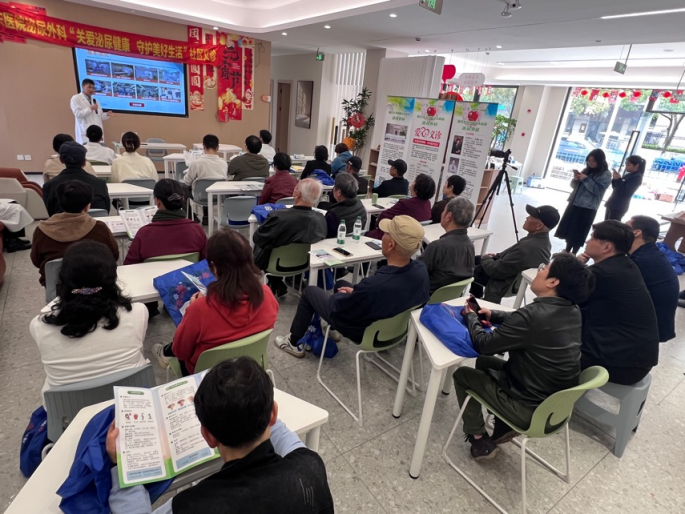 活动伊始,张海梁主任介绍了华东医院及科室“微创化、精准化”诊疗特色和本次义诊的初衷,强调泌尿健康对中老年群体生活质量的重要性,呼吁大家树立“早发现、早干预”的健康意识。随后,两位专家分别开展科普讲座,沈志远教授围绕前列腺健康基础知识,张忠云教授围绕尿失禁诊治进展等内容,用通俗易懂的语言讲解疾病成因、症状及日常护理技巧,现场居民认真聆听、积极提问,互动氛围热烈。